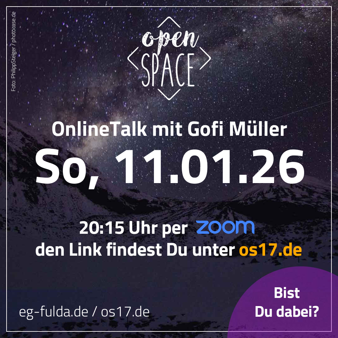 Beim openSPACE-OnlineTalk ist der Ort egal. Dabei sind Leute aus Fulda, aber auch aus Marburg, Schwäbisch Hall, Nürnberg, Offenbach, Hannover, Hamburg und Köln. Genauso unterschiedlich wie die Orte sind auch unseren Ansichten und unser Glaube. Wir treffen uns monatlich für gut zwei Stunden zu verschiedenen Themen. Die Themen werden von den Teilnehmenden vorbereitet und Gofi Müller moderiert den Abend. Um 21:45 Uhr ist fast immer Schluss.