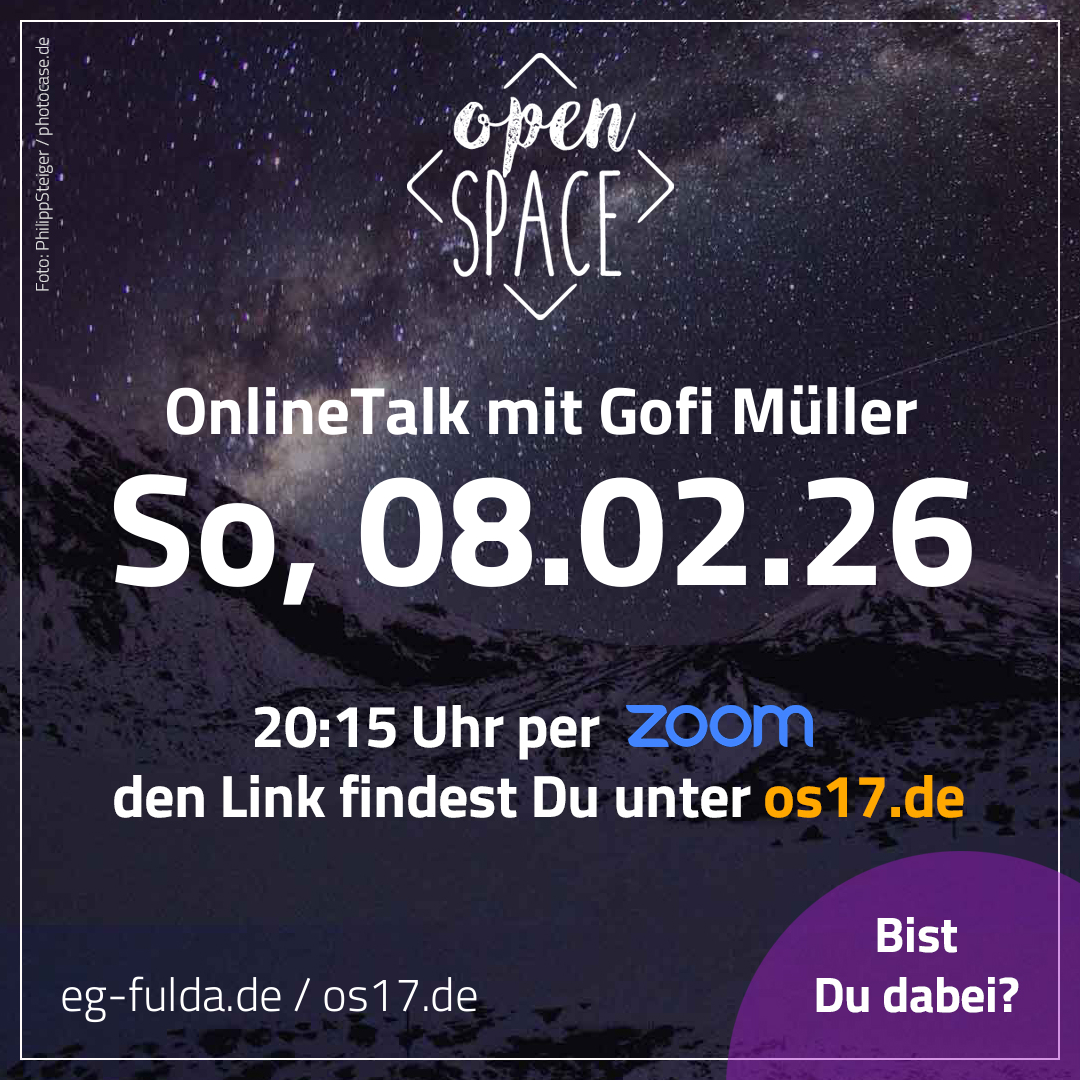 Beim openSPACE-OnlineTalk ist der Ort egal. Dabei sind Leute aus Fulda, aber auch aus Marburg, Schwäbisch Hall, Nürnberg, Offenbach, Hannover, Hamburg und Köln. Genauso unterschiedlich wie die Orte sind auch unseren Ansichten und unser Glaube. Wir treffen uns monatlich für gut zwei Stunden zu verschiedenen Themen. Die Themen werden von den Teilnehmenden vorbereitet und Gofi Müller moderiert den Abend. Um 21:45 Uhr ist fast immer Schluss.