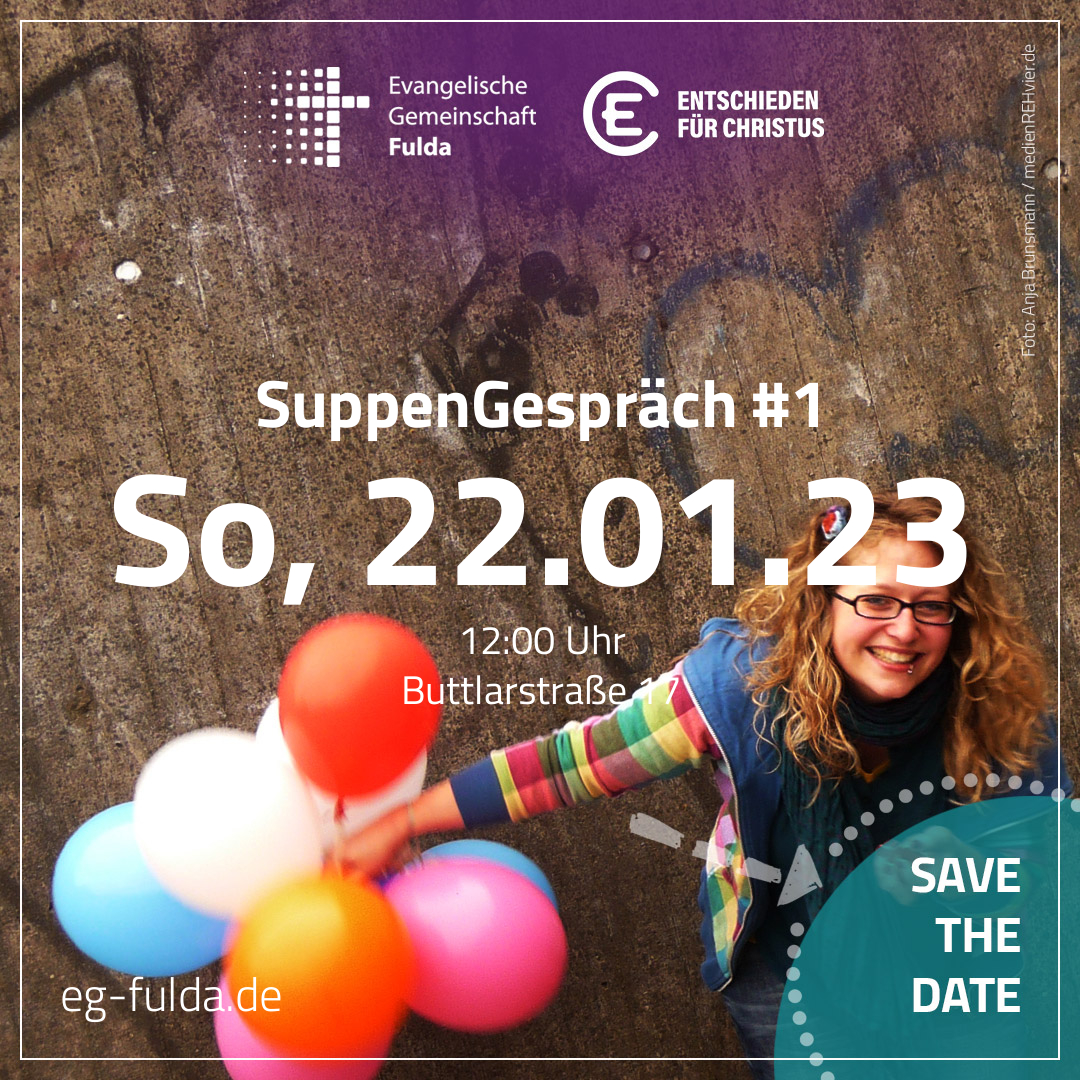 Anja und Hans-Martin laden euch ein - zum SuppenGespräch am So, 22.01.2023 um 12:00 Uhr: Ziel dieses Treffens ist es - neben der leckeren Suppe - generationsübergreifend Austausch zu haben und mehr voneinander zu erfahren. Zum Abschluss werden wir gemeinsam für die unsere Gemeinschaft und unseren Visionsarbeit beten. Herzlich willkommen!